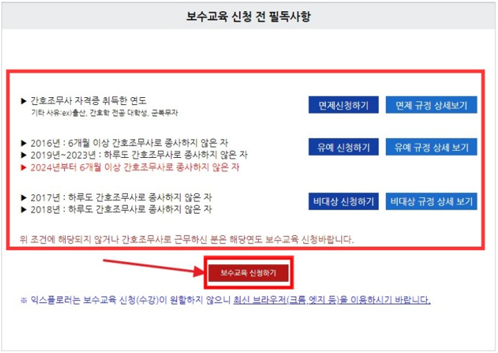 6. 보수교육 신청 전 필독사항을 확인 후 하단의 [보수교육 신청하기] 버튼을 클릭해 주세요.