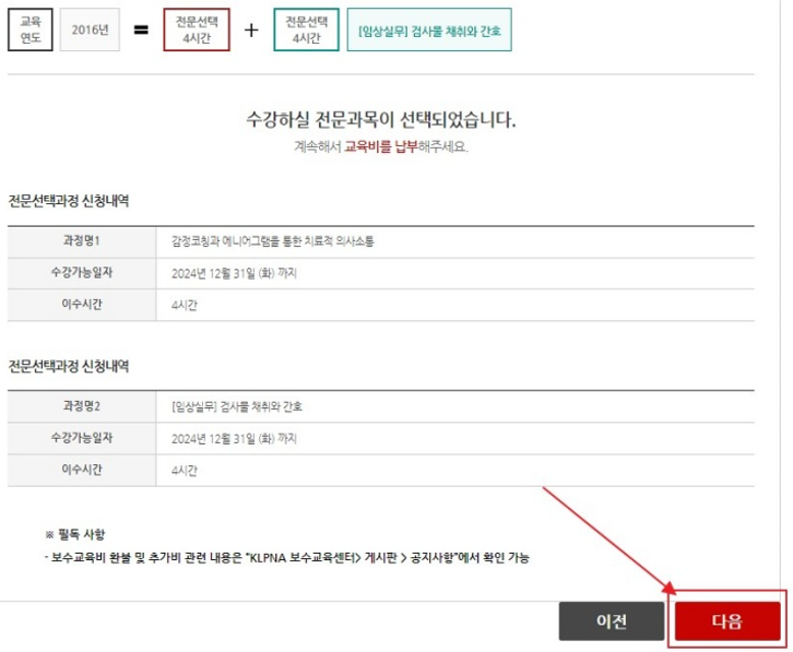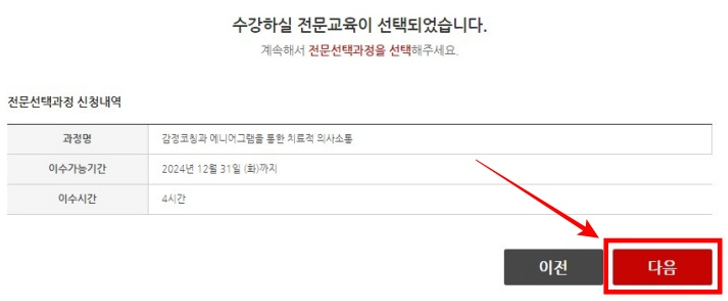 15. 수강신청할 전문선택 과정명을 확인하신 후 [다음] 버튼을 클릭해 주세요.