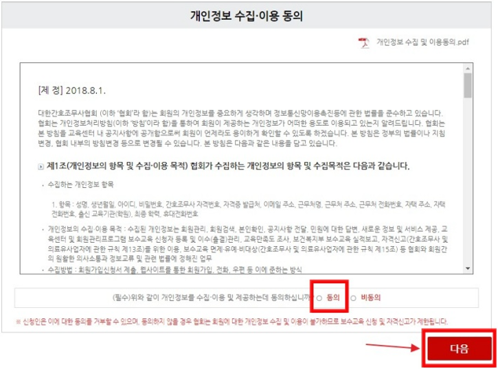 7. 개인정보 수집 이용 동의 확인 후 동의란에 체크, 하단의 [다음] 버튼을 클릭해 주세요.