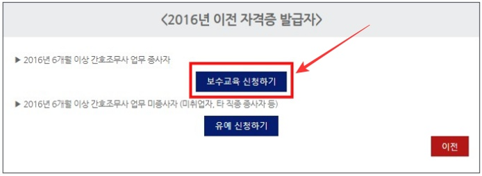 10. 2016년 이전, 이후 자격증 발급자 화면을 확인한 후 [보수교육 신청하기] 버튼을 클릭해 주세요. 자격증 발급연도를 잘못선택했다면 [이전] 버튼을 눌러 변경할 수 있습니다.