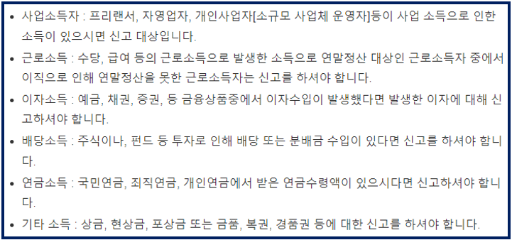 종합소득세 신고 대상은 지난 1년 동안 소득(근로, 이자, 배당, 연금, 사업, 기타)이 발생한 개인, 사업자 모두 신고 대상에 해당됩니다.
