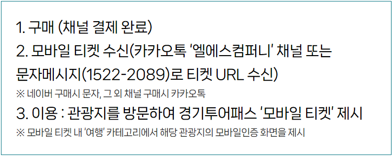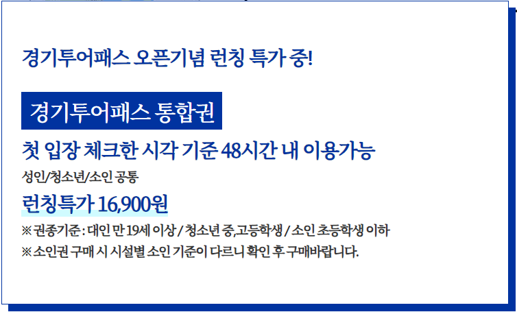 - 경기투어패스는 이미 할인 혜택이 적용된 상품으로 별도 할인 쿠폰 및 복지 할인 등의 중복 할인이 불가능합니다.