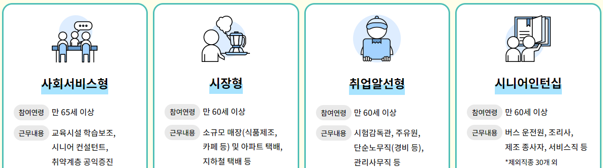 은 참여 연령과 근무내용에 따라서 사회서비스형, 시장형, 취업알선형, 시니어인텁십 네 가지로 구분됩니다. 이 중에서 사회서비스형은 연령이 만 65세 이상만 가능하며, 나머지 3가지 유형은 만 60세 이상부터 참여가능합니다.