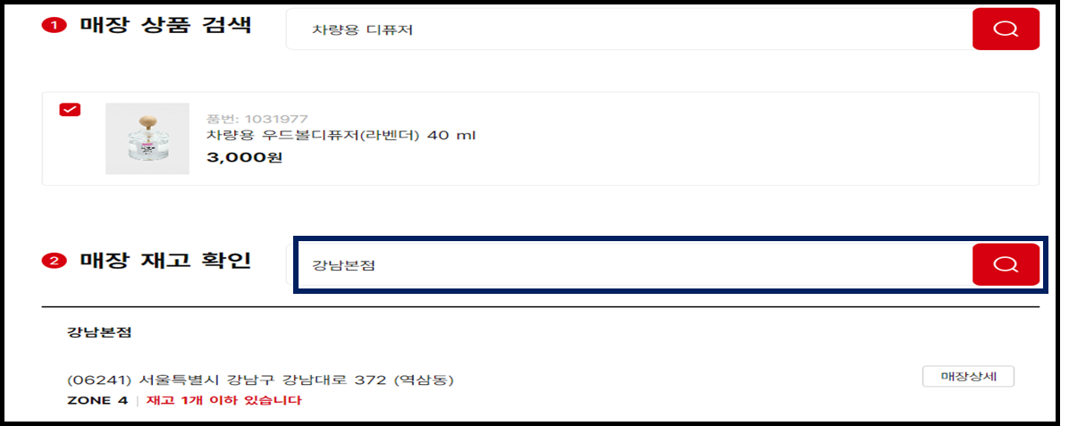 위에서 매장 상품 검색까지 완료한 뒤에 매장 재고 확인 버튼을 통해 근처의 가까운 매장을 선택하면, 매장별 현재 재고가 확인됩니다.