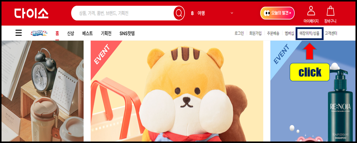 '다이소몰' 공식사이트 접속한 뒤에 오른쪽 상단 마이페이지 바로 밑에 위치한 [매장위치/상품] 메뉴를 클릭합니다.