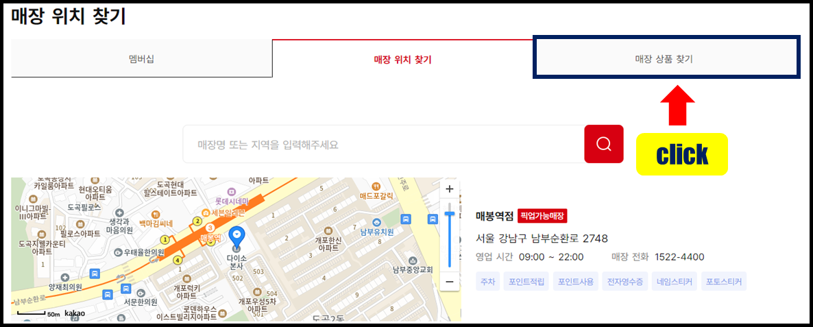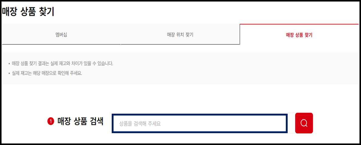 [매장 상품 찾기]에서 구매를 원하는 상품을 검색합니다. 상품명은 정확하지 않더라도 유사한 상품명을 입력하면 검색이 가능합니다.