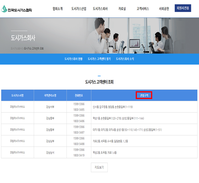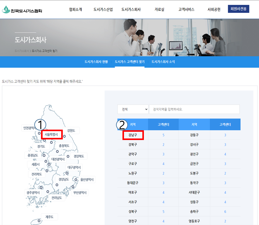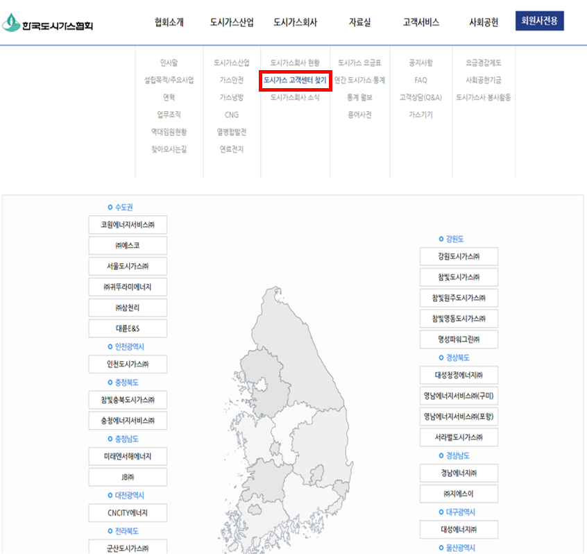 ① 한국도시가스협회 사이트에 접속하여 도시가스회사 ▶ 도시가스 고객센터 찾기로 이동합니다.