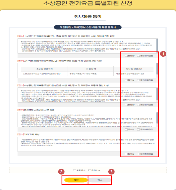 6. 정보제공 동의를 읽고 동의함에 체크를 모두 체크한 뒤, 아래의 [확인] 버튼을 누릅니다.
