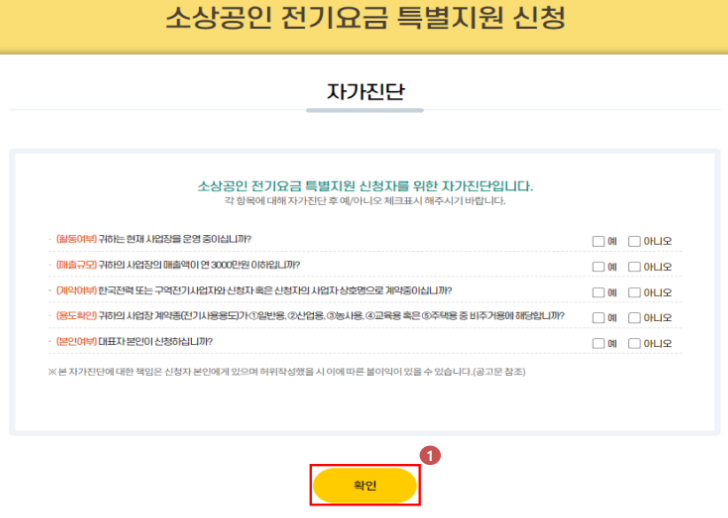 4. 자가진단 항목을 체크한 뒤에 아래의 [확인] 버튼을 누릅니다.