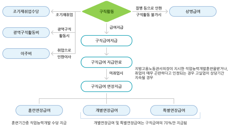 실업상태인 경우 > 구직등록 > 거주지 관할 고용센터 방문 > 수급자격인정 신청하기 > 구직급여 신청 > 구직활동 > 구직급여 지급 > 구직급여 지급 만료