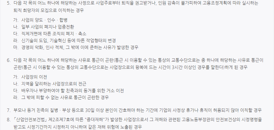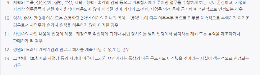 수급요건에 제한되지 아니하는 정당한 이직 사유는 총 13가지의 유형으로 구분되어 임금체불, 사업의 양도·인수·합병, 일부사업의 폐지나 업종전환 등의 세부 사유들이 존재하니 꼭 확인해보시기 바랍니다.