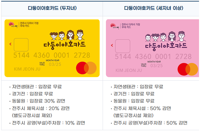 - 전주 다둥이 야호카드는 두자녀와 세자녀에 따라 일부(전주시 체육시설, 전주시 공영 주차장) 시설의 감면 혜택이 다르게 적용됩니다.