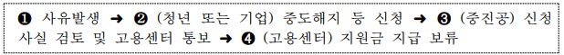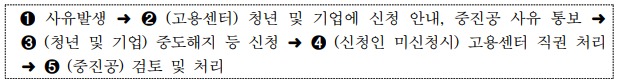 다만, 고용센터가 중도해지 사유를 먼저 확인하게 된 경우에는 청년 및 실시기업에 신청인이 직접 신청해야 함을 안내하고, 중진공에도 사유를 즉시 통보하게 됩니다. 그러나 청년 및 실시기업이 중도해지를 신청해야 함을 안내했음에도 불구하고 사유 발생일로부터 1개월 이내에 신청을 하지 않으면 중진공에 직접 신청하고 그 사유를 통보하게 됩니다.