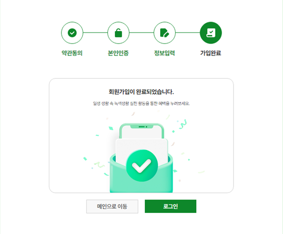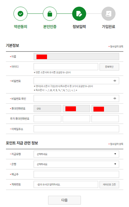 회원가입은 총 4단계를 거쳐 진행되며, 명의 기준으로 포인트가 지급되므로 공동인증서 또는 휴대폰 인증을 해주셔야 합니다. 또한, 탄소중립포인트 실천활동을 통해 포인트를 얻게 되면 현금을 지급받을 수 있기에 본인명의 계좌를 넣게 되는데 이때에는 정확하게 입력하셔야 포인트를 계좌로 받으실 수 있습니다.