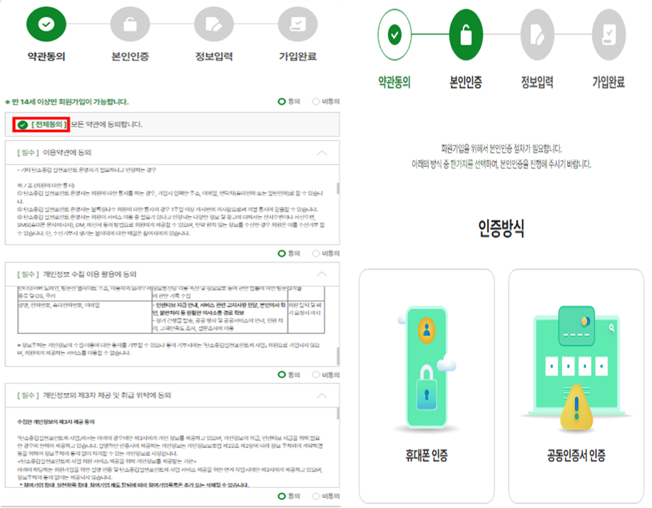 1. 약관동의 →2. 본인인증 → 3. 정보입력 → 4. 가입완료 |