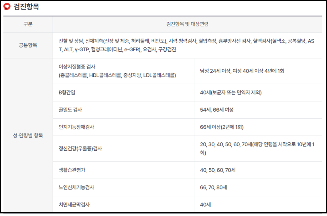 건강검진은 공통적으로 제공되는 항목과 성별, 연령에 따라 제공되는 항목이 있습니다.
