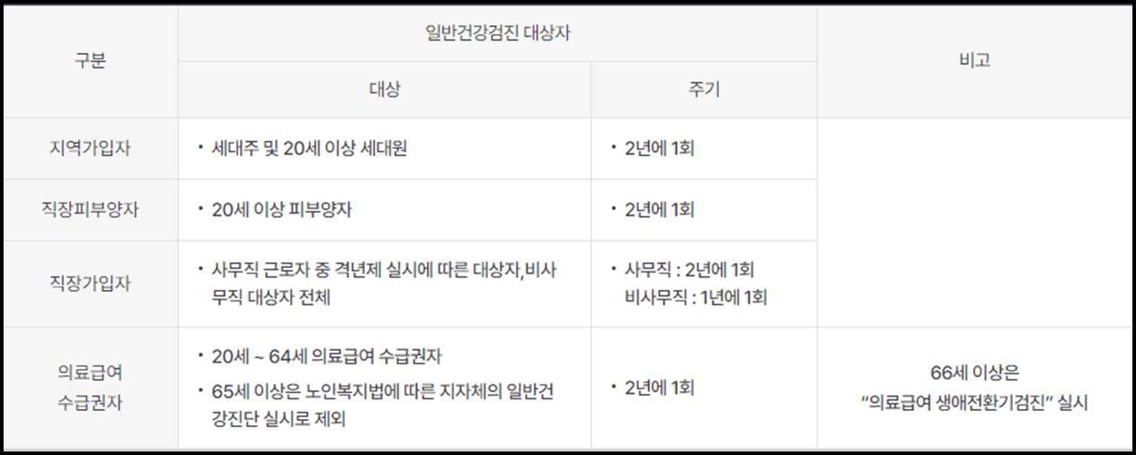 우리가 알고 있는 일반건강검진은 지역가입자, 직장피부양자, 직장가입자, 의료급여 수급권자인지 대상 여부에 따라 연령과 주기가 달라집니다.