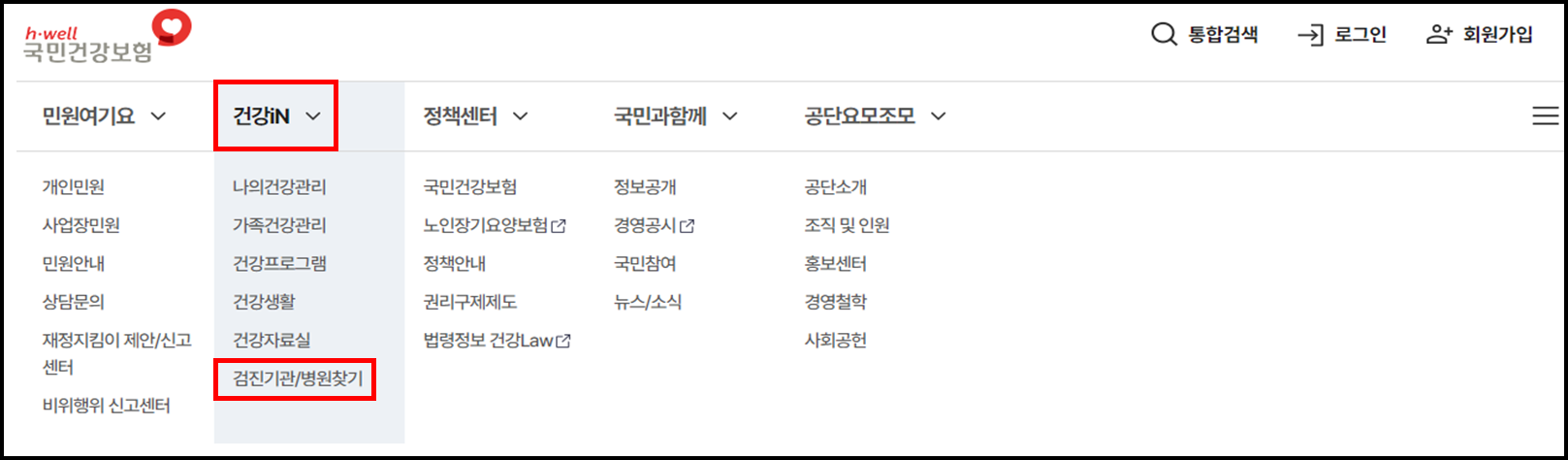① 국민건강보험공단에 접속하여 상단에 위치한 [건강 iN]을 클릭한 뒤, [검진기관/병원 찾기]를 선택합니다.